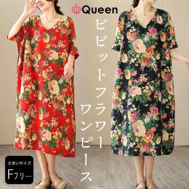 大きいサイズ レディース 花柄ワンピース Vネック オーバーサイズ リゾート 麻タッチ 夏 LL 3L 4L 5L 6L ネイビー レッド 新入荷 ネコポ