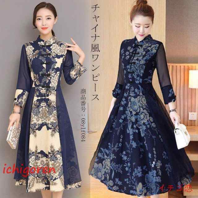 ワンピース レディース ロング丈 チャイナ風ワンピース チャイナドレス チャイナ服 ドレスワンピース 花柄 フレアワンピース Aライン 着