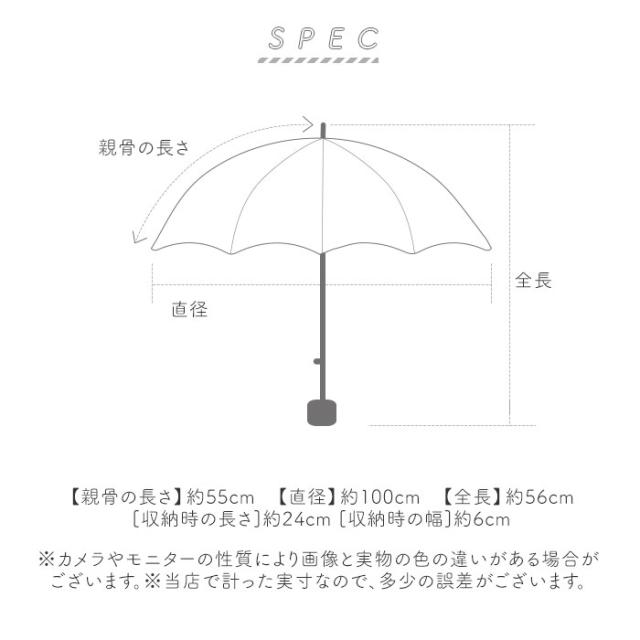 | サイズ | [親骨の長さ]約55cm/[直径]約100cm/[全長]約56cm [収納時の長さ]約24cm [収納時の幅]約6cm ※サイズは当店計測の実寸サイズです。実際の商品ならびにメーカー表記サイズとは多少の誤差が生じる場合がございます。あらかじめご了承ください。 |