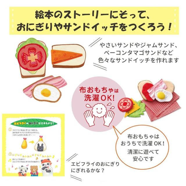 | 内容物 | 【おこめくんとママのおにぎりやさん】 絵本・おにぎり(ポケットなし)・おにぎり(ポケットあり)・サケ・うめぼし・エビフライ・のり(ノーマル)・のり(うさぎ型)・クロス×各1 【しょくぱんくんとサンドイッチ】 絵本・トマト・チーズ・レタス・タマゴ・ジャム・クロス×各1、ベーコン・パン×各2 |