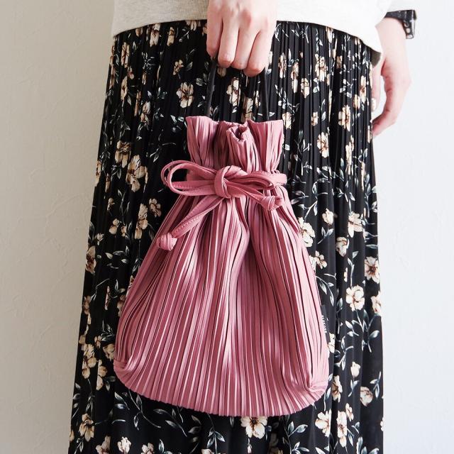 プリーツ加工が生み出すふんわりとしたフォルムが魅力的な巾着タイプ。裏地付きで型崩れしにくく、美しいシルエットをキープします。