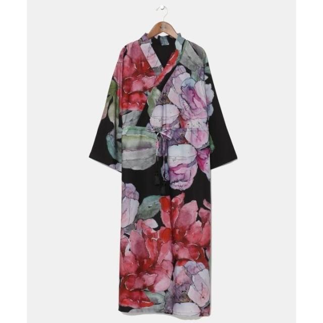 水彩画のように滲んだデザインが特徴の着物風ワンピース。シワになりにくい素材で、ゆったりとしたシルエットになっています。さらりとした着心地で、軽やかに着こなせる一枚。両サイドポケット付き。