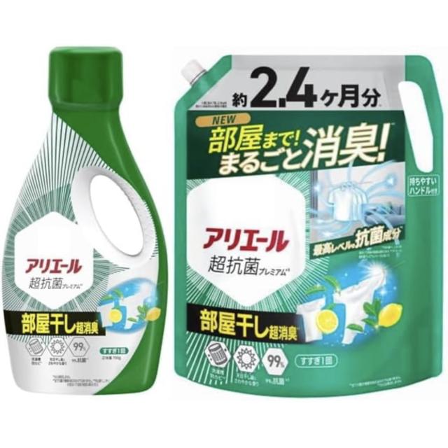 *1 P&G調べ。ニオイの度合いで消臭の程度は異なります。 *2 アリエール超抗菌プレミアムシリーズにおいて。 *3 全ての菌の増殖を抑えるわけではありません。 *4 カビは除去しません。 *5 2023年のアリエール超抗菌プレミアムシリーズ比。