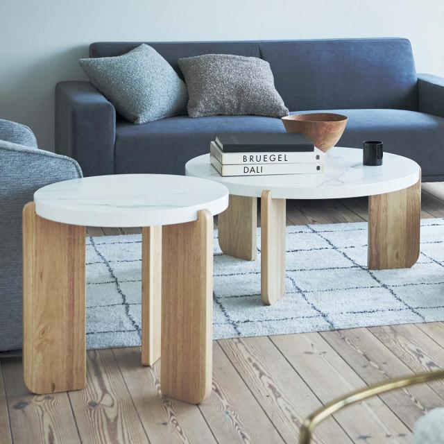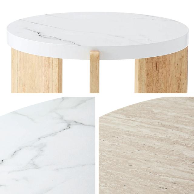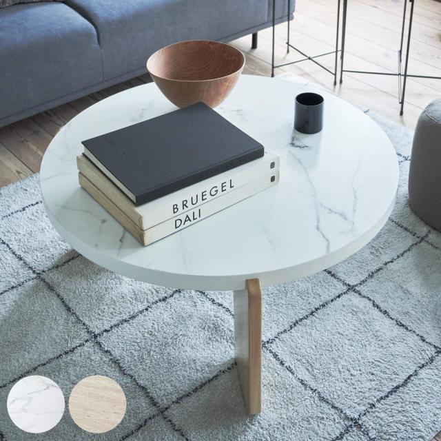 直径50cmと小さめで丸い天板です。木目調と大理石調のカラー展開で、それぞれの素材感を楽しめます。丸みを持たせたデザインなので、小さなお子様がいるご家庭でも安心してお使いいただけます。
