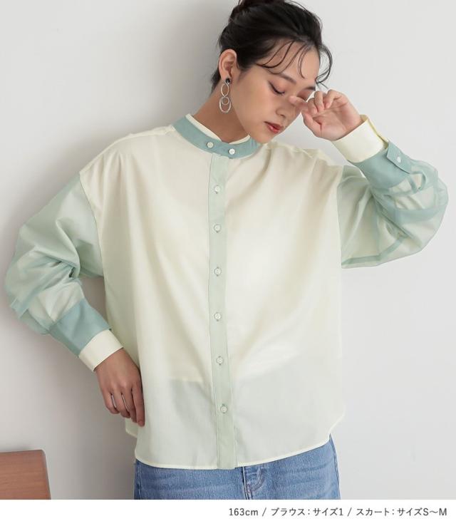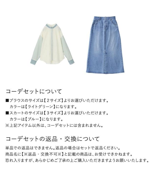 ブルー 青 グリーン 緑 ライトグリーン 202504 2点セット プレゼント ブラウス レディース トップス 長袖 シャツ チュール レイヤード 重ね着 異素材 羽織 春 秋 ボタンシャツ スタンドネック 大人女子 大人可愛い お洒落可愛い 大人カジュアル ベーシック ラフ オフィスカジュアル 上品 きれいめ ナチュラル ミディ丈 ミドル丈 チュニック丈 配色 無地 シアー 透け感 おうちで洗える 夏 カジュアル シンプル モード キレカジ フェミニン Sサイズ Mサイズ Lサイズ LLサイズ 3Lサイズ XLサイズ ぽっちゃり 体型カバー 大きいサイズ プラスサイズ 女子会 オフィス 通勤 通学 お買い物 お出掛け 旅行 リゾート レジャー おしゃれ お洒落 トレンド 流行 スカート ボトムス デニムスカート ナロースカート ロング丈 ストレッチ ストレスフリー デニム ロングスカート マキシ丈 Iライン ウエストゴム スリット 綿混 ポケット 冬 オールシーズン ゆったり ゆる 楽ちん お尻が隠れる すっきり 福袋 コーディネートセット コーデセット 中身が見える福袋 上下セット[ID]11cn0zr[チュール重ねブラウス×デニムスカートコーデ2点SET]