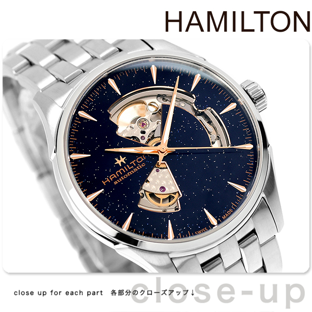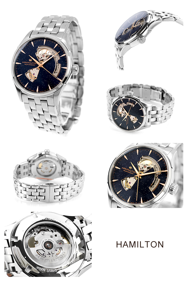 3年保証キャンペーン ハミルトン ジャズマスター 42mm オープンハート スイス製 メンズ 腕時計 H32705140 HAMILTON JAZZMASTER Open Heart Auto アナログ ブルー ◆HAMILTON(ハミルトン)はアメリカ発祥の老舗ブランドです。創業翌年に誕生した懐中時計「ブロードウェイ・リミテッド」は、他の時計よりも正確に時を刻むことから鉄道用時計として採用されました。その後も航空用時計や軍用時計として採用されるなど、品質の高さと流行にながされない独自のデザインが世界中の人々に支持されています。コンテンポラリーで洗練されたデザインと高度なクラフツマンシップが見事に融合した「ジャズマスター オープン ハート」。魅力的なミッドナイトブルーのダイヤルが輝き、アイキャッチなタイムピース。都会的な設計が放つ現代性と、無限の宇宙を表現したカラーが融合したモデルです。 機械式腕時計