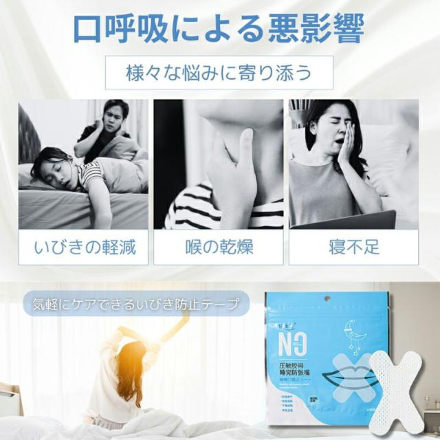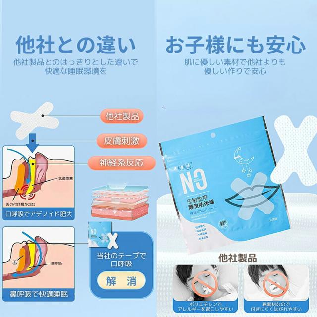 商品詳細: 睡眠時の口呼吸を防ぎ、いびきの音を軽減し、鼻呼吸の習慣をつけるために使用する口閉じテープです。 口呼吸から鼻呼吸へ自然に導いて睡眠中の口や喉の乾燥を防ぎ、安眠をサポートします。