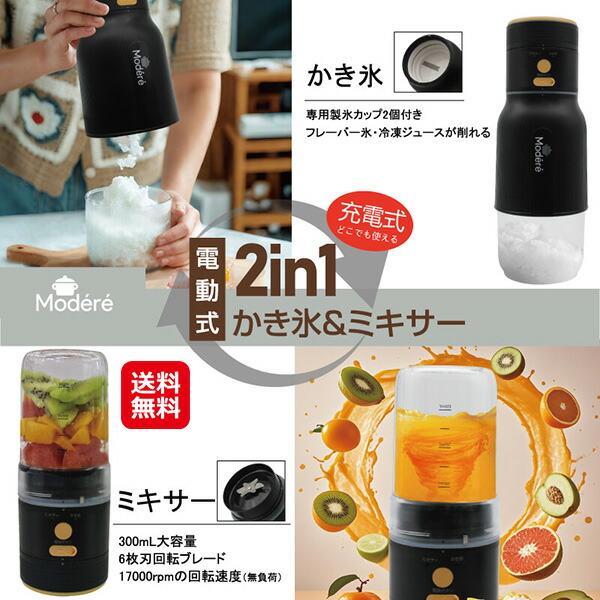 【Modere 電動式2in1かき氷&ミキサー HDL-7431】【送料無料】 かき氷器 電動 コードレス 冷凍ジュースが削れる 製氷カップ2個付き ミキサー 充電式 大容量 300ml 6枚刃 ジュース スムージーが作れる 持ち運び キャンプ ピクニック sd