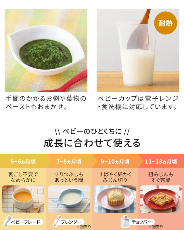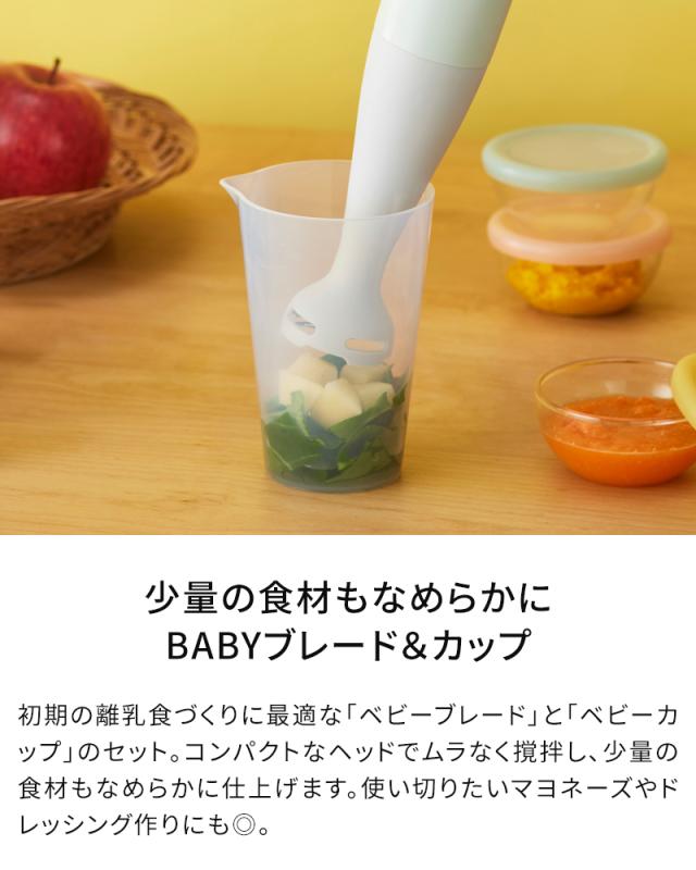 BRUNO(ブルーノ)マルチスティックブレンダー2専用アタッチメント「ベビーブレード」と「ベビーカップ」のセットです。コンパクトなヘッドで少量の食材もムラなく撹拌。なめらかなペースト状に仕上げます。ベビーカップは電子レンジに対応しているので、調理もスムーズ。離乳食専用に、用途を分けて使用したい時にもおすすめのアタッチメントです。