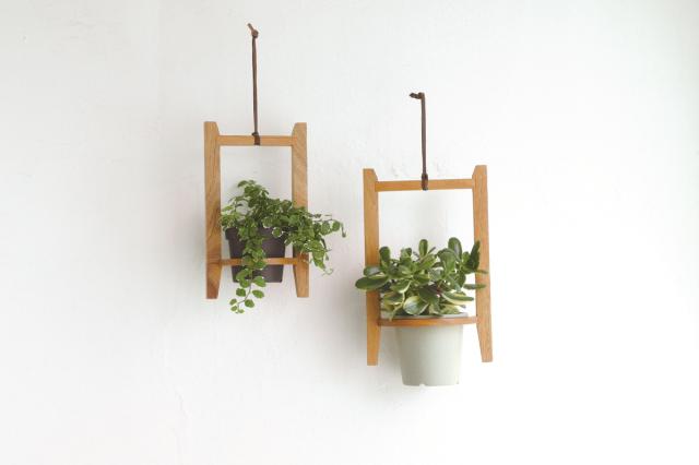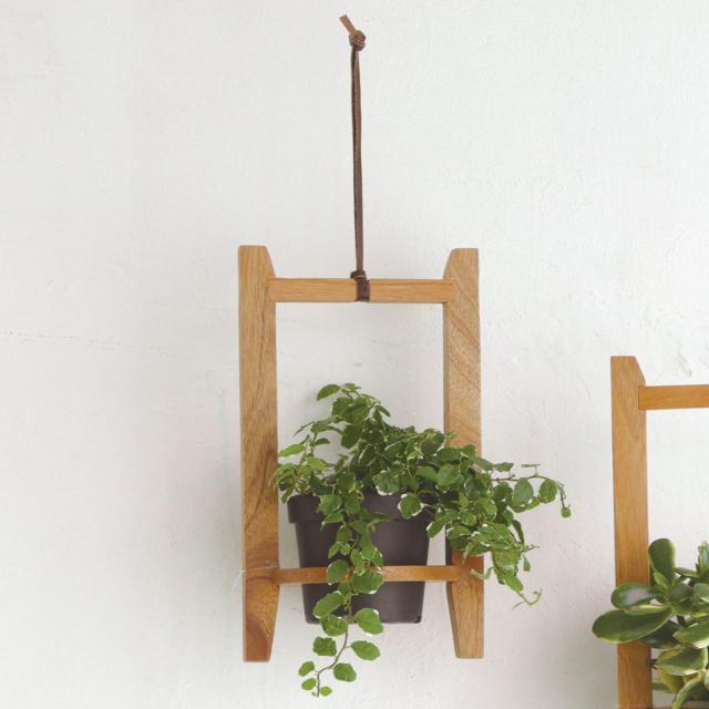 マホガニーの持つ木の温もりと素材感を活かしたポットハンギング Sサイズです。お気に入りの鉢と植物も吊るすことで、また違った表情になります。天井に設置したチェーンフックなどに革紐を吊るすことでハンギングをお楽しみいただけます。