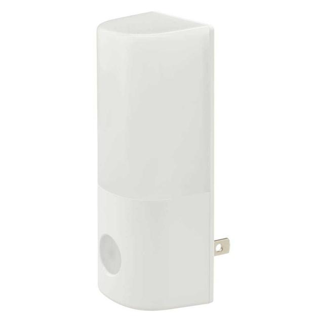 暗くなると自動点灯、LEDを上向きにして周囲を明るく、LEDを下向きにして足元を明るく、明るさ約65ルーメン、周囲の明るさに合わせて光の強さを自動調整、コンセントに差し込むだけ