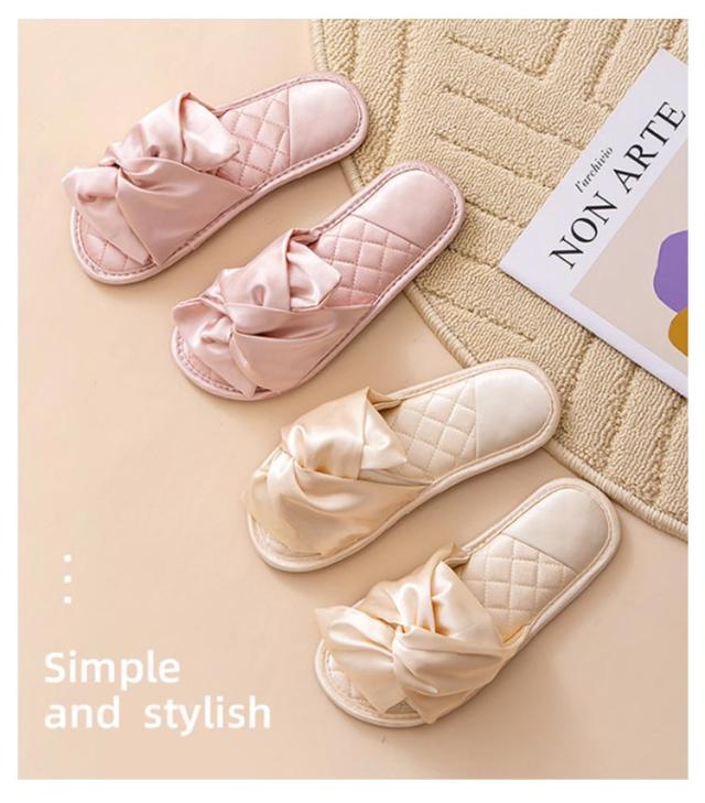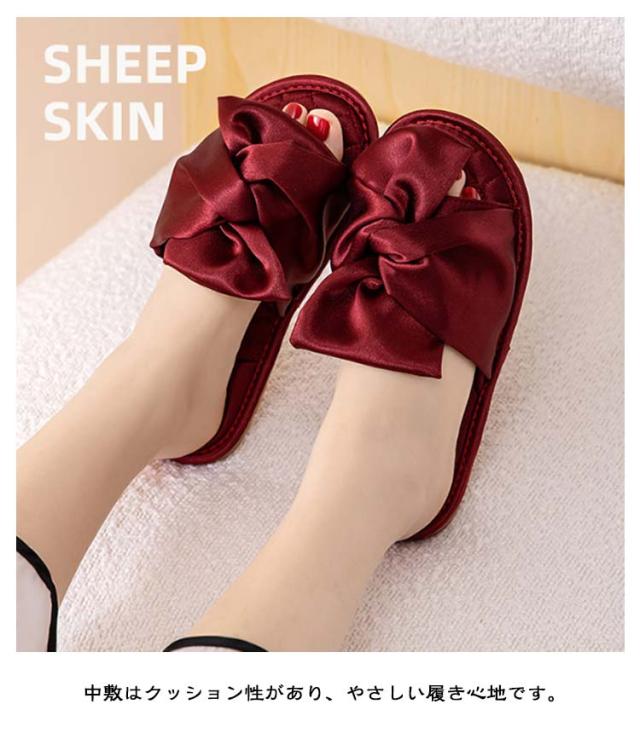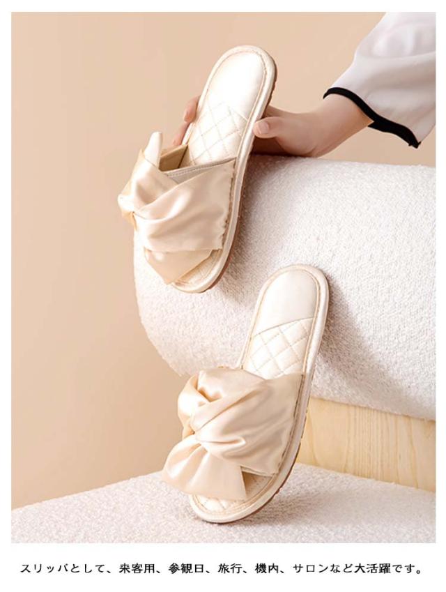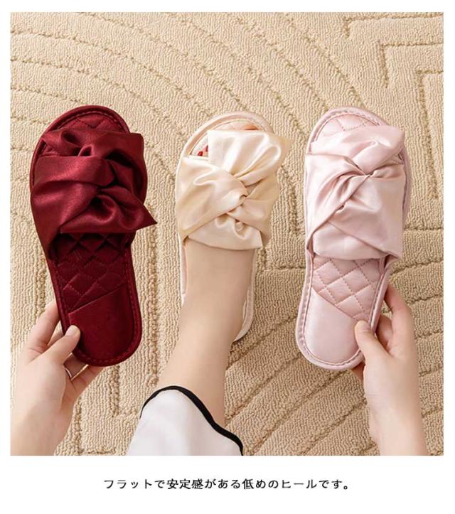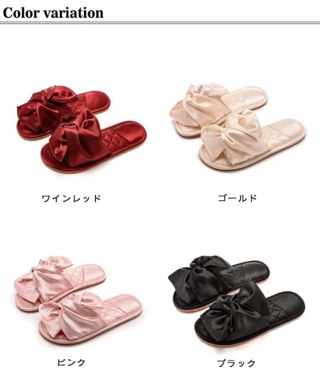 サンダル レディース サテン調 光沢 リボン スリッパ ルームシューズ 黒 ピンク 赤 ゴールド 室内履き 部屋履き フラット 上品 エレガント 美脚 おしゃれ かわいい 来客用 滑り止め 旅行 機内 サロン ホテル カフェ 送料無料