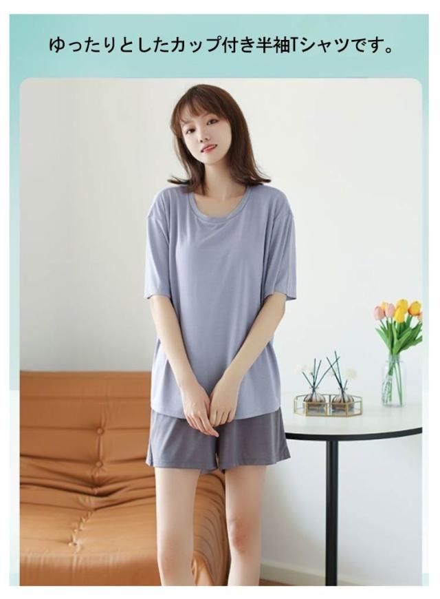 | ゆったりとしたカップ付き半袖Tシャツです。 サラリとした風合いのモーダル素材 ルームウエアとしてはもちろん、お休みの時にもおすすめ | |