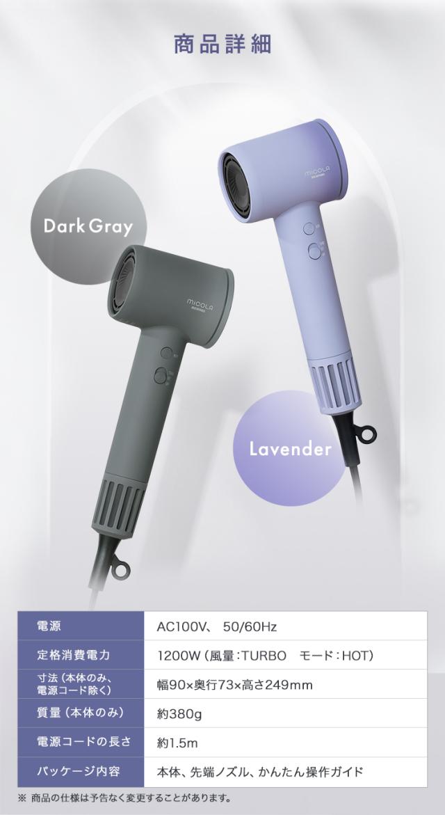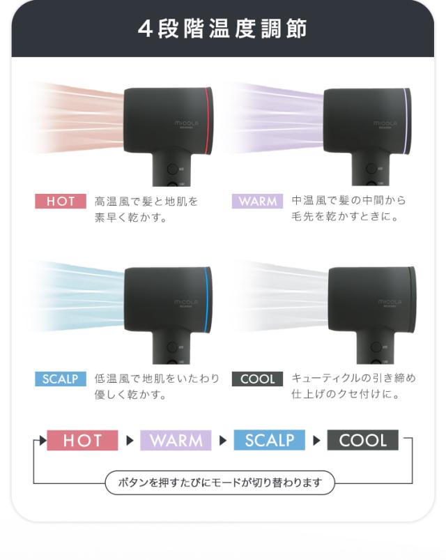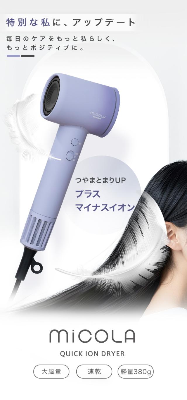 [検索用:2種ノズルでより快適 ドライヤー MiCOLA クイックイオンドライヤー 大風量 速乾 軽量 時短 4段階温度調整 ヘアドライヤー プラスマイナスイオン 低温 頭皮ケア 軽い ミコラ ]