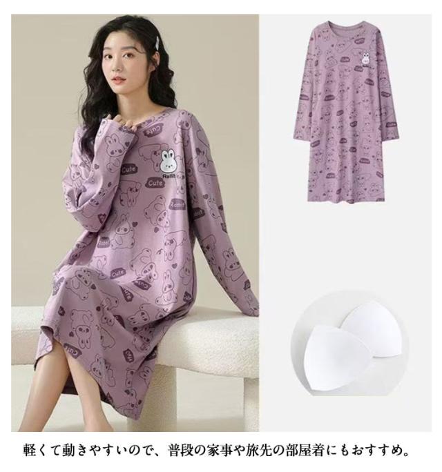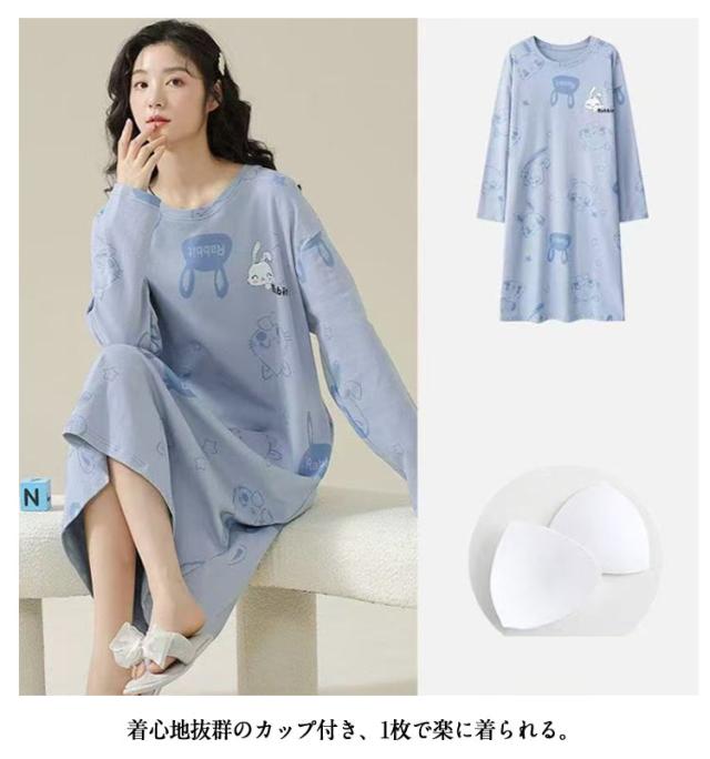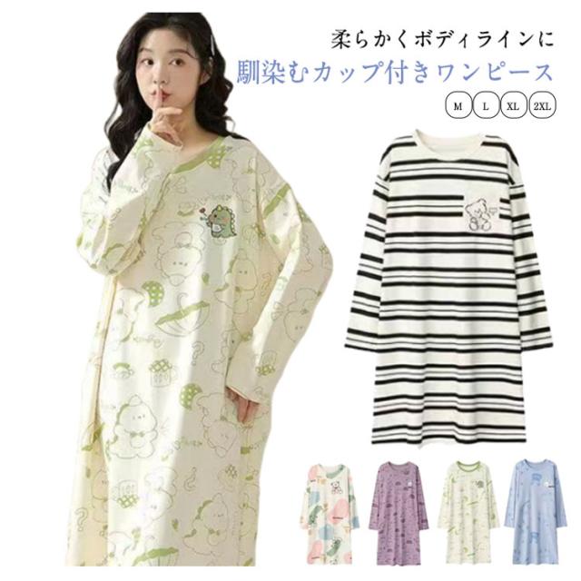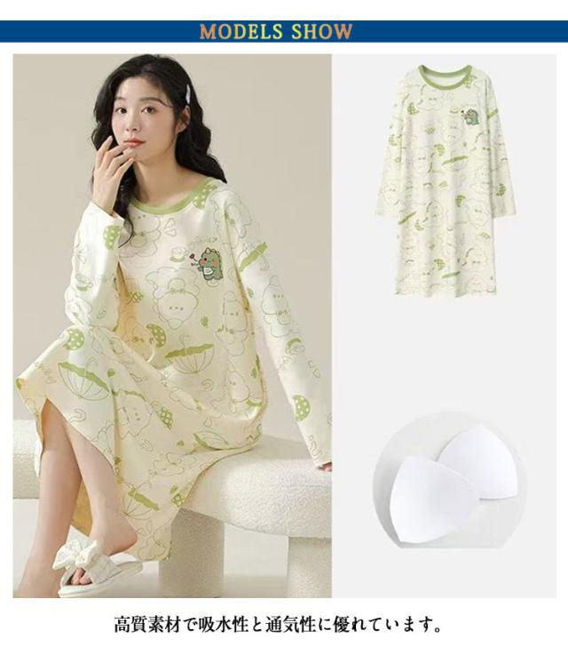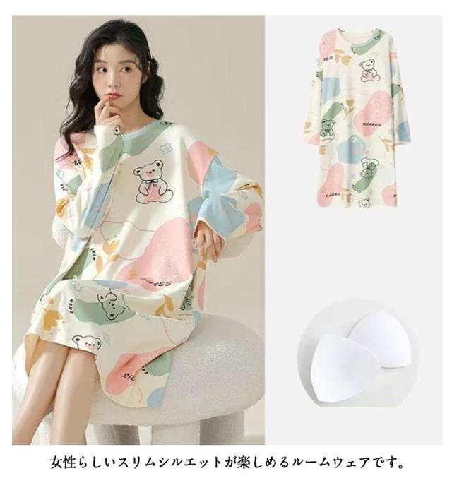 夏 カップ付き ルームウェア 長袖 レディース 部屋着 可愛い ワンピース ルームウェア 胸パッド付き 夏 ワンピース パジャマ ナイトウェア ロング丈 柔らかい ゆったり 無地 春 ルームウェア 秋 母の日 敬老の日 誕生日 ギフト プレゼント
