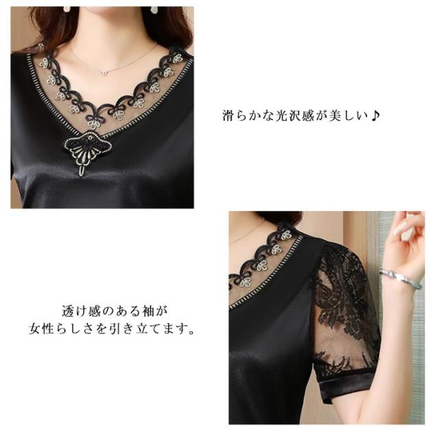 半袖 サテン風 Vネック vネック トップス 大人 ブラウス ブラウス レディース シフォンブラウス トップス おしゃれ ツルツル 女性 大きいサイズ 光沢感 無地 シンプル きれいめ レース カジュアル かわいい 春夏 薄手 ホワイト ブラック
