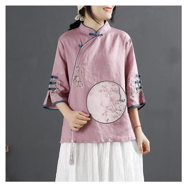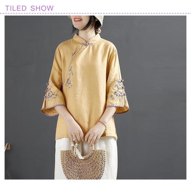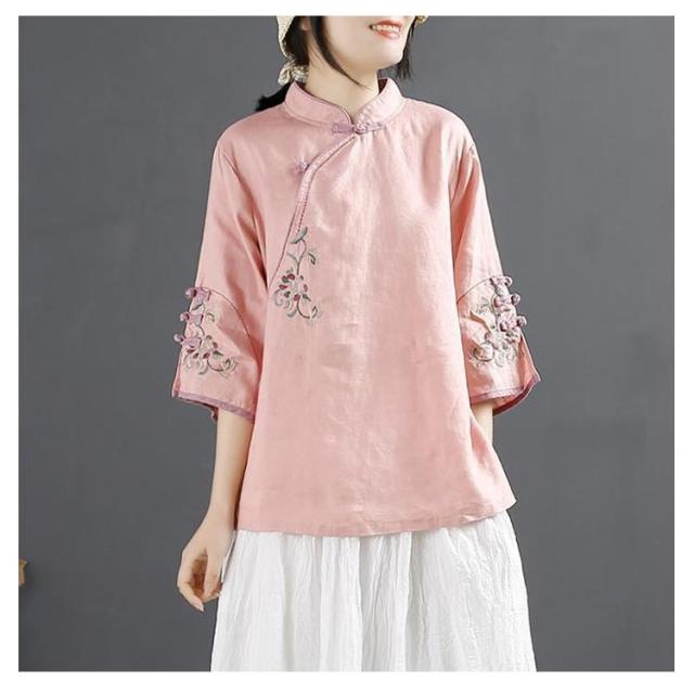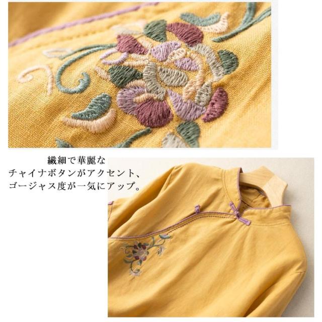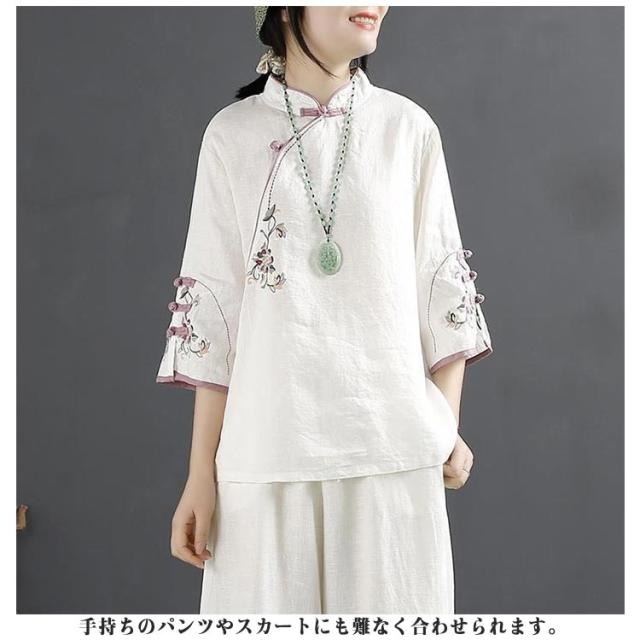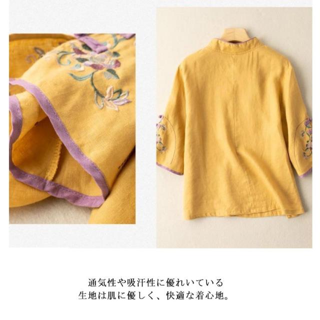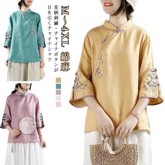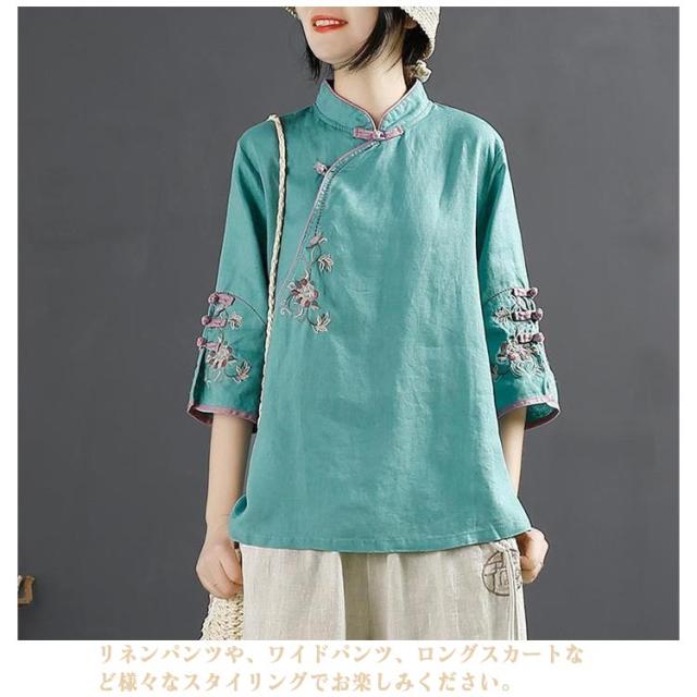 花柄 綿麻ブラウス レディース 綿麻ブラウス 大きいサイズ 刺繍 チャイナシャツ チャイナ風 七分袖 薄手 体型カバー 前開き トップス ブラウス スタンドカラー リネン混 きれいめ おしゃれ 中華風 かわいい ゆったり