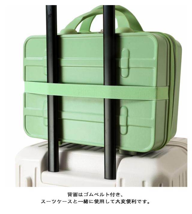 | たっぷりの大容量、機内持込み可能ハードスーツケース ちょっとしたお出かけや、旅行の時に入り切らない小物を入れたり、様々なシーンで大活躍のミニスーツケース。 たっぷりの大容量、小物は別々収納できるのもうれしいポイント。 角あたでしっかり補強しているので、ダメージを受けやすいコーナー部分も安心です。 耐衝撃、軽量なABS素材を採用し、表面には傷がつきにくい加工を施されて、丈夫で長くご愛用いただけます。 背面はゴムベルト付き、スーツケースと一緒に使用して大変便利です。 シンプルなデザインはお手持ちのスーツケースに合わせやすい♪ | |