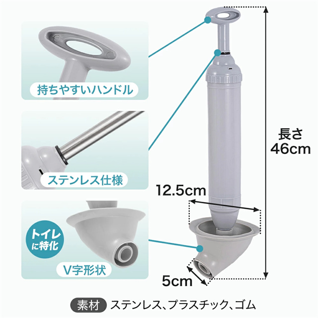 | 説明 | 急なトイレのトラブルに即対応!一般的なすっぽんと比べてコツいらず、トイレ詰まりに特化した真空式パイプクリーナーです。 先端部分をV字状にしたことで、ほとんどの便器にスムーズにはまり、空気が漏れにくい形状に仕上げました。 無駄なく加圧が出来るため、短時間で詰まりを解消できます。 万が一、押し込みすぎてラバー部分が凹んだり潰れてしまっても、60℃ほどのお湯につける事で形状が元に戻ります。慌てて買い替える必要はありません。 トイレ専用のすっぽんとして設計したことで詰まり解消に特化した構造に。トイレのトラブルをすぐに解決したい、と考えている方へオススメのアイテムです。 ●注意点 持ち手を強く限界まで引くと抜けてしまう可能性が御座います。限界まで持ち手を引かなくても十分お使い頂けます。また、ハンドル部分が引きにくい場合は回しながら引く事でスムーズに動きます。 |