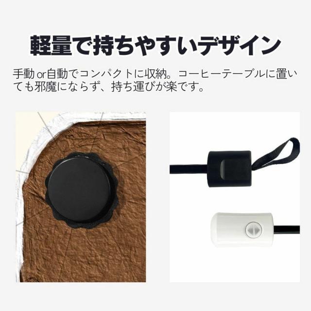 折りたたみ(手動 / 自動)でコンパクトに収納。重量 306〜356g と軽量なので、コーヒーテーブルに置いても邪魔にならず、持ち運びが楽です。