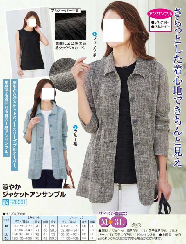 完売 アンサンブル レディース きれいめ 春夏 シャツジャケット ノースリーブ 涼やか ジャケットアンサンブル 全2色 婦人服 ミセス シニア 女性 ブラック ブルー グレー 水色 黒 丸首 クルーネック サマージャケット 50代 60代 70代 80代 90代 母の日 お母さん fri p26981