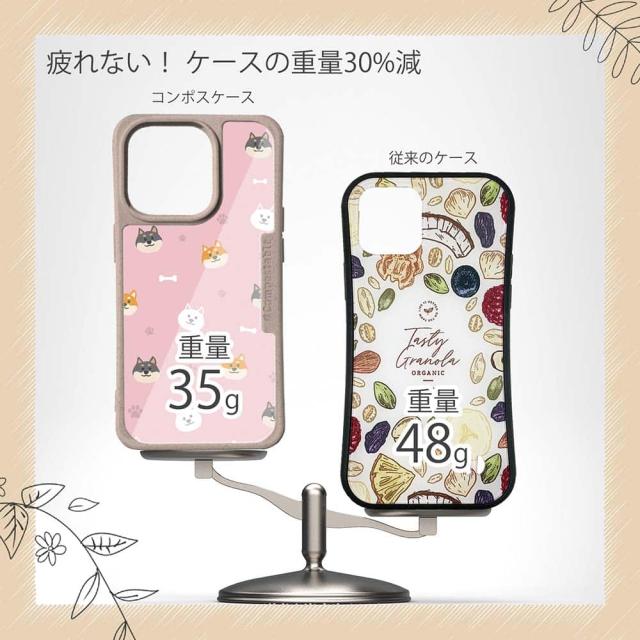 | ケースについて | 背面の内側に入れ込むデザインシートで、シーンに合わせて着せ替え可能。また、グリップしやすいクッション構造で、本体重量は約35gと軽減化を実現。さらに衝撃に強いSライン形状、究極に押しやすいボタン設計(切り込みが入ることで押し込む力を軽減)、背面のカメラ・レンズを保護する高さ設計となっております。生分解性プラスチック素材ながらも着脱もしやすく、割れない・指紋防止加工を施しています。 |