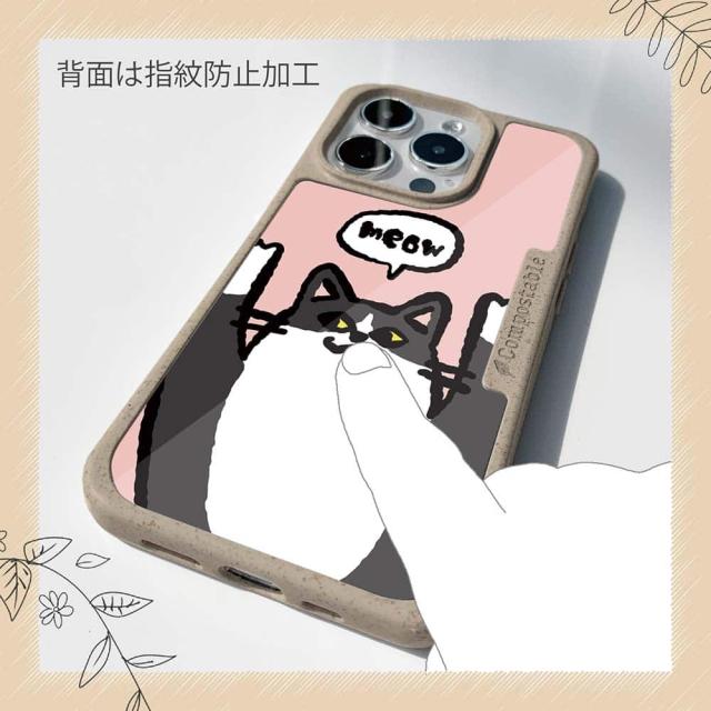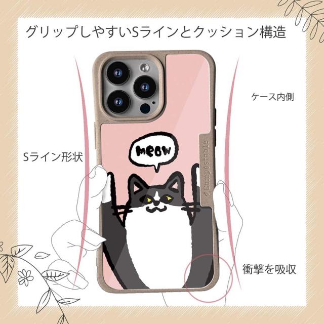 | ケースについて | 背面の内側に入れ込むデザインシートで、シーンに合わせて着せ替え可能。また、グリップしやすいクッション構造で、本体重量は約35gと軽減化を実現。さらに衝撃に強いSライン形状、究極に押しやすいボタン設計(切り込みが入ることで押し込む力を軽減)、背面のカメラ・レンズを保護する高さ設計となっております。生分解性プラスチック素材ながらも着脱もしやすく、割れない・指紋防止加工を施しています。 |