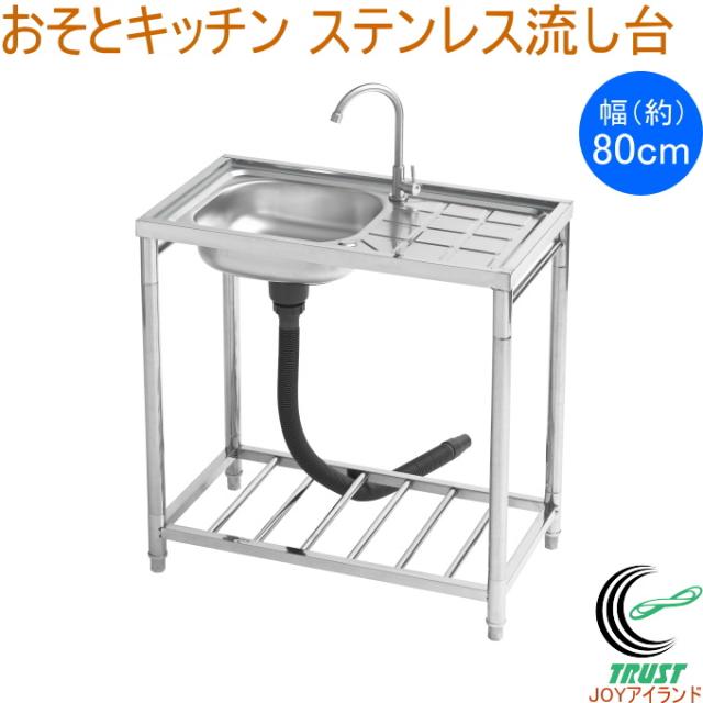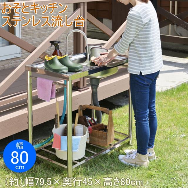 おそとキッチン ステンレス流し台 80 蛇口付 OK-80SJ 送料無料 エクステリア ガーデン 園芸 アウトドア 庭 簡易流し台 屋外用 流し台 キッチン ステンレス製 組立式 工具不要 アジャスター付 棚板付 サンカ SANKA