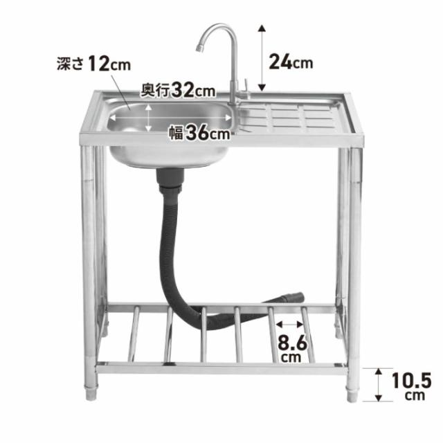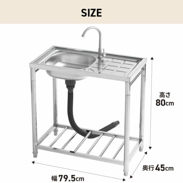 | サイズ | 外寸:(約)幅79.5×奥行45×高さ80cm(蛇口取付時の高さ104cm) シンク内寸:(約)幅36×奥行32×深さ12cm 重量:(約)5.4kg |