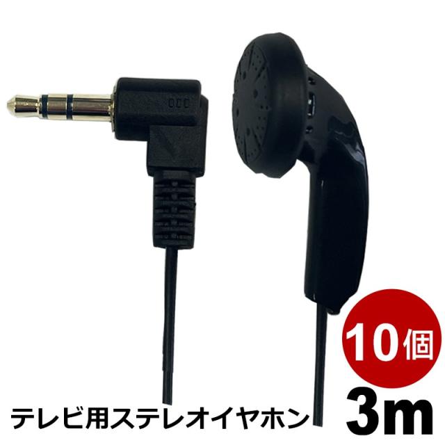 テレビイヤホン 3m 10個 高音質 ロングコード 片耳 有線 3.5mmプラグ 軽量 平型 L型プラグ ステレオイヤホン 3Aカンパニー EAR-LSFT03BK-10P メール便送料無料