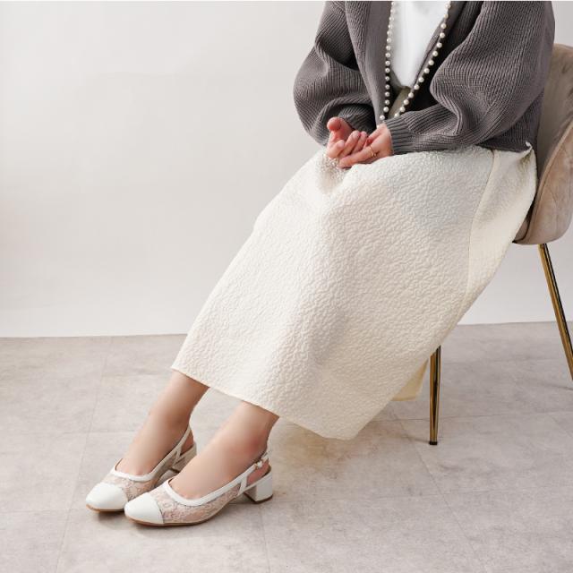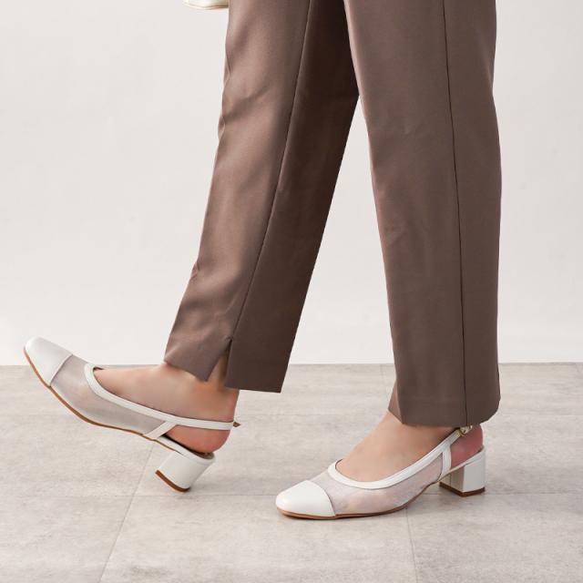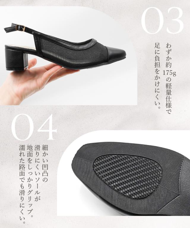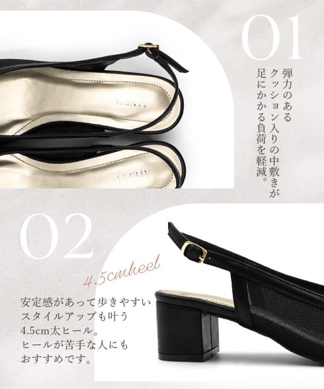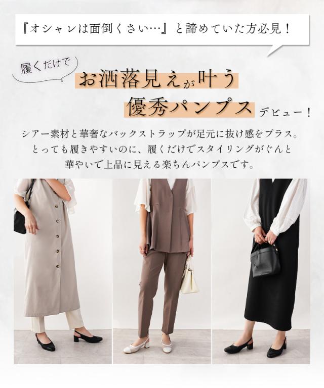 ■シアー素材と華奢なバックストラップが足元に抜け感をプラス。履きやすいのに、履くだけでスタイリングがぐんと華やいで上品に見える楽ちんデザイン。
