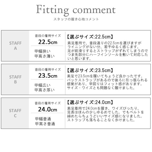 - 足のサイズ小さいためパンプス、サンダル系がなかなか合わないので不安でしたがバックストラップがついているのでなんとかなるかと思い購入。1番短くなる穴にしたら脱げることは無く一安心。デザインは写真の通り涼...