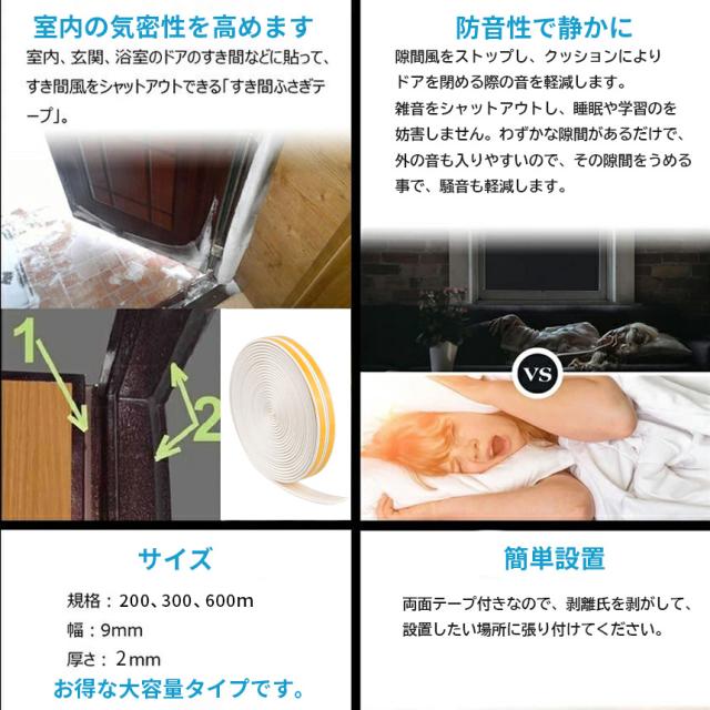 隙間テープ すきま風防止 600m 防音パッキン 気密 冷暖房効率アップ 窓 サッシ ドア 玄関 防音 防風 防虫 花粉 ホコリ侵入防止 戸あたり 引き戸 虫塵