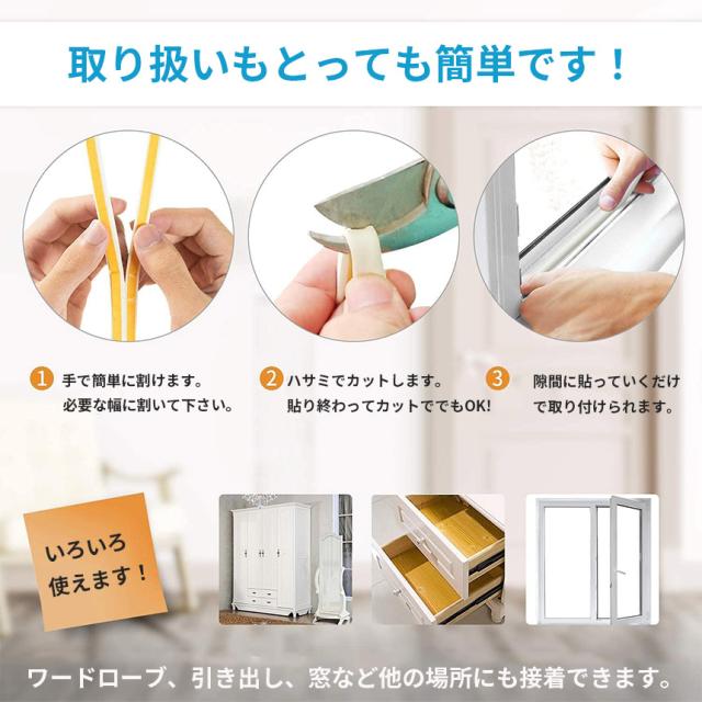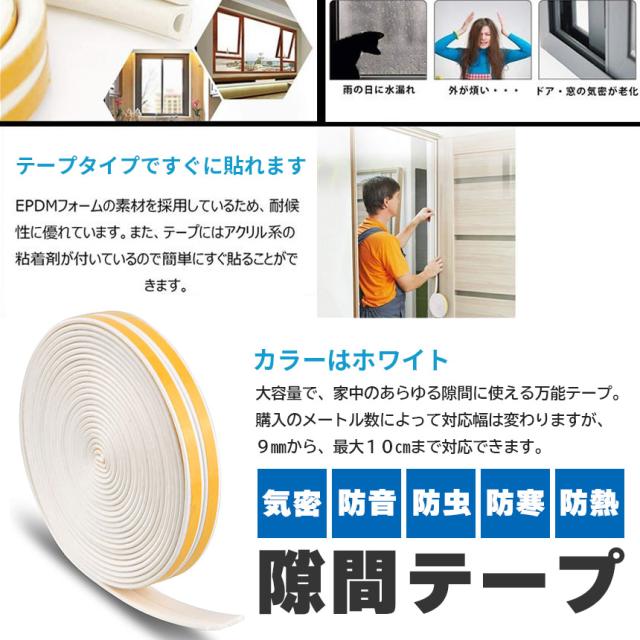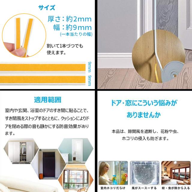 騒音、ほこり、冷風、水漏れ、蚊など、家のドアや窓の隙間から発生する問題を解決、軽減してくれる簡単設置の隙間テープです。幅約9mm、厚さ約2mmで厚いものと比べて汎用生の高い製品です。