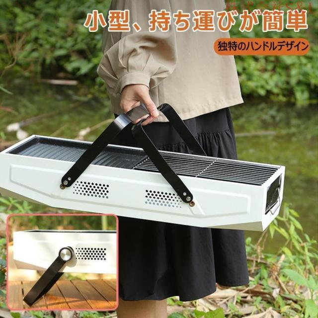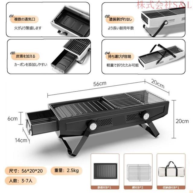 【ポータブルバーベキューコンロ】製品サイズ約56*20*20cm、重量約2.5 KG、白と黒の2種類があり、BBQトレイ×1、BBQトレイ×2、収納袋×1。