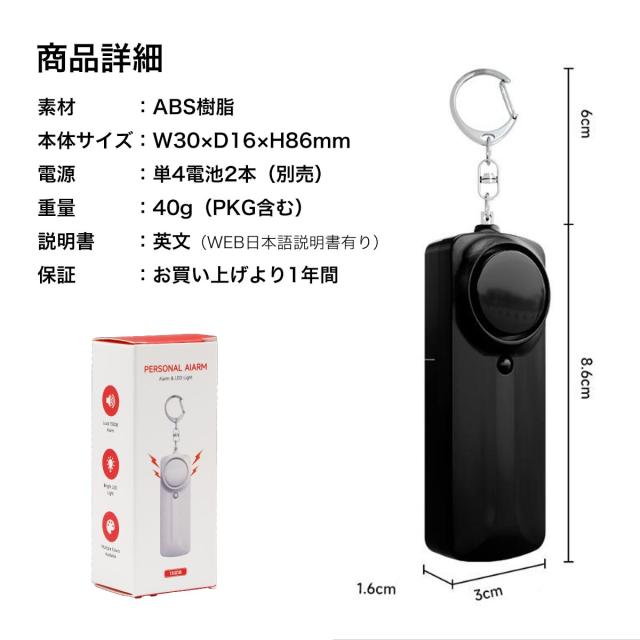 毎日の安心をサポートするコンパクト防犯ブザー。 突然の危険に対して、緊急時に130dBの大音量アラームと強烈なLEDライトで周囲に危険を知らせます。カラビナ付きでバッグやリュックに簡単に取り付け可能、いつでも手の届く位置に。 特長: 簡単操作: ピンを引くだけで即座に大音量アラームと強いライトが点灯し、周囲に警告。緊急時にも直感的に使用できます。LEDライト搭載: 暗い場所でも手元を照らすLEDライト付き。2回押しでフラッシュライトとしても使用可能。防犯アラームは130dBの大音量と耳に残る高音で、近くの不審者にも明確に危険を伝えます。水しぶきや汗にも強い生活防水仕様で、雨の日でも安心して使えます。※水が直接かかったり水に漬かると故障の原因となりますのでご注意ください。カラーも豊富でブラック、ホワイト、ターコイズ、ピンク、イエロー、パープル、ブルーと全7色からお選びいただけます。 使用方法: 緊急時にピンを引くだけで、アラームが鳴り響きます。 LEDライトで暗闇の中で手元を照らすことができ、非常に便利。 ピンを戻すことで、アラームを止めることができ、何度でも使用可能です。 おすすめシーン: 通学や通勤、夜間の外出時の防犯対策として、また暗い場所で手元を照らしたい時にも便利です。特に女性やお子様へのプレゼントにも最適です。 注意事項: 水が直接かかったり水に浸ける行為は故障の原因となりますのでご注意ください。 この防犯ブザーで、もしもの時に安心を。小型で軽量、カバンに付けて毎日持ち歩けるので、万が一の時に備えておきましょう! |