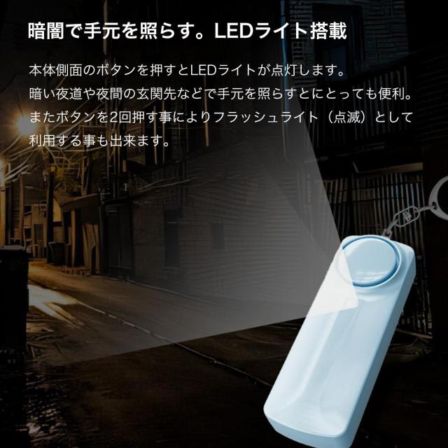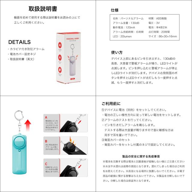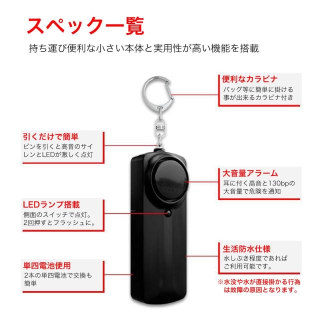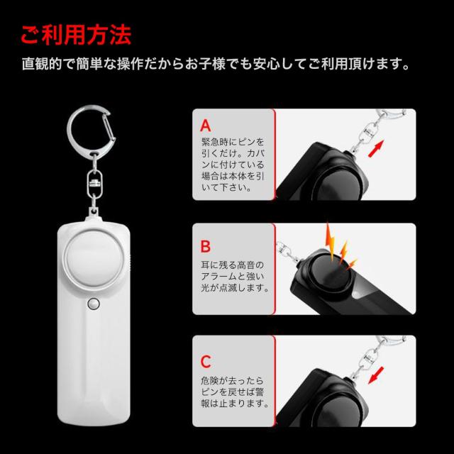 毎日の安心をサポートするコンパクト防犯ブザー。突然の危険に対して、緊急時に130dBの大音量アラームと強烈なLEDライトで周囲に危険を知らせます。カラビナ付きでバッグやリュックに簡単に取り付け可能、いつでも手の届く位置にあります。ピンを引くだけで即座に大音量アラームと強いライトが点灯し、周囲に警告を発するので緊急時にも直感的に使用できます。LEDライトが搭載されており、暗い場所でも手元を照らすことができ、2回押しでフラッシュライトとしても使用可能です。130dBの大音量アラームで、近くの不審者にも明確に危険を伝え、生活防水仕様なので水しぶきや汗にも強く、雨の日でも安心して使えます。ブラック、ホワイト、ターコイズ、ピンク、イエロー、パープル、ブルーと全7色からお選びいただけます。通学や通勤、夜間の外出時の防犯対策として、また暗い場所で手元を照らしたい時にも便利で、特に女性やお子様へのプレゼントにも最適です。ピンを引くことでアラームが鳴り響き、LEDライトで暗闇の中で手元を照らすことができ、ピンを戻すことでアラームを止めることができ、何度でも使用可能です。水に浸ける行為は故障の原因となる場合があるため、水に完全に浸さないようにご注意