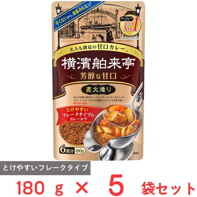 異国情緒あふれる西洋文化発祥の街、横濱で生まれた絶品欧風カレーをご家庭で手軽に楽しむことができる『フレークタイプのカレールウ』です。【商品特長】りんごや桃の果実ピューレにソテーオニオンをブレンド。フォン・ド・ヴォーのコクと厳選したスパイスが香り高い辛くない甘口。 辛くないから、家族みんなで! とけやすいフレークタイプのカレールウ大人も満足の甘口カレー。 直火造り!【使用方法】【使用方法_材料】おいしい作り方 材料例(6皿分) 本品1袋(180g)、肉300g、玉ねぎ大2個(400g)、にんじん中1本(150g)、水750ml(3 3/4カップ)、サラダ油大さじ1(15ml)【使用方法_レシピ】1.炒める 厚手の鍋にサラダ油を熱し、ひと口大に切った具材をよく炒めます。2.水を入れ、煮込む 沸騰したらアクを取り、鍋にふたをして煮込みます。(沸騰後約20分)3.火を止めルウを入れる 一度火を止めて、ルウを入れてよく溶かします。4.煮込む 時々かき混ぜながら煮込みます。(約10分)とろみがついたら出来あがりです。こだわりの作り方 1.の手順で、玉ねぎは薄切りにしてキツネ色になるまで炒め、他の具材を加えて炒めます。