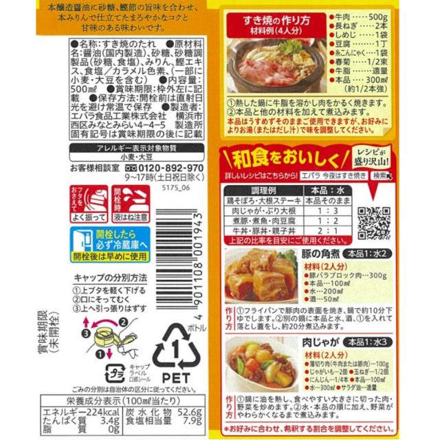 商品名 エバラ食品 すき焼のたれ マイルド 500ml×12本 容量 500ml×12本 原材料名 醤油(国内製造)、砂糖、砂糖調製品(砂糖、食塩)、みりん、鰹エキス、食塩/カラメル色素、(一部に小麦・大豆を含む) アレルギー特定原材料 小麦 賞味期限 商品の発送時点で、30日以上あるものをお届けいたします 保存方法 開栓前は直射日光を避け、常温で保存してください。