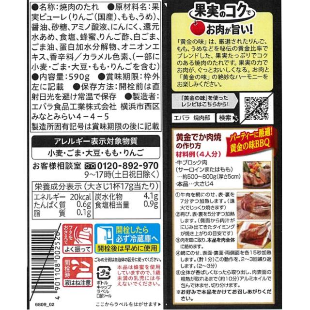 商品名 エバラ食品 黄金の味 中辛 590g×6本 容量 590g×6本 原材料名 果実ピューレ(りんご(国産)、もも、うめ)、醤油、砂糖、アミノ酸液、にんにく、還元水あめ、食塩、蜂蜜、りんご酢、白ごま、ごま油、蛋白加水分解物、オニオンエキス、香辛料/カラメル色素、(一部に小麦・ごま・大豆・もも・りんごを含む) アレルギー特定原材料 小麦 賞味期限 商品の発送時点で、30日以上あるものをお届けいたします 保存方法 開栓前は直射日光を避け、常温で保存してください。