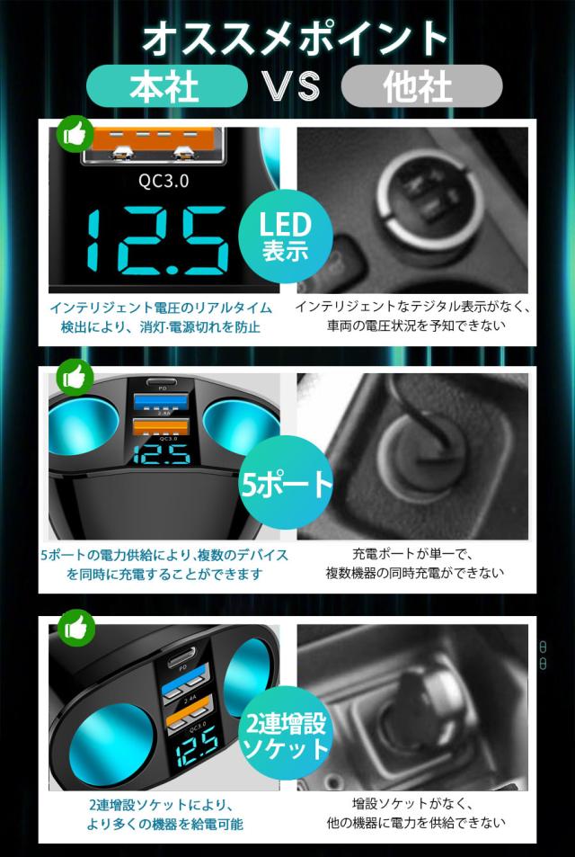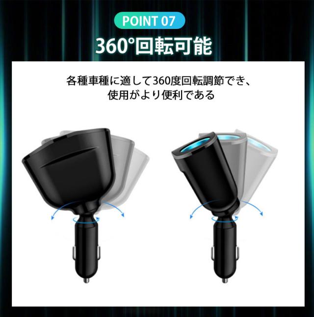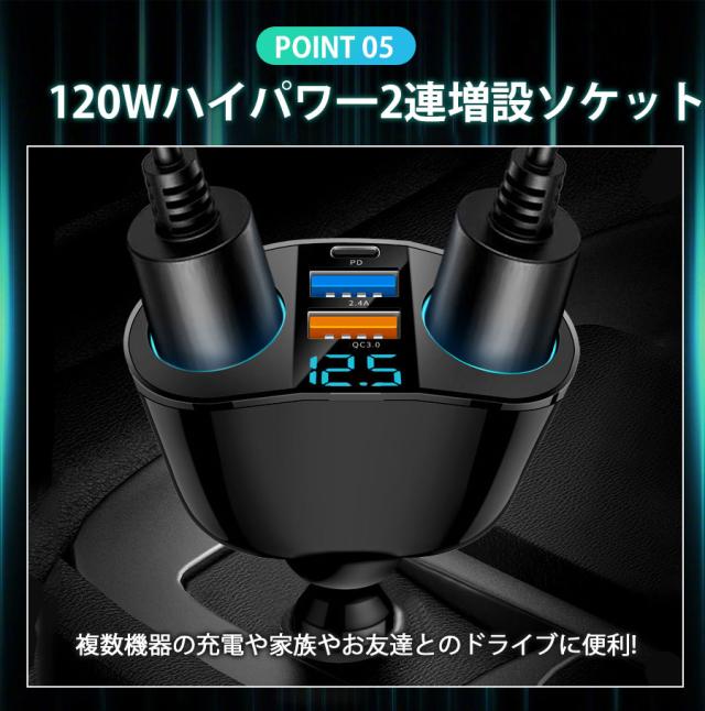 2口シガーソケットを増設して、様々な車載用品に対応可能、例えば、Fmトランスミッター、タブレット、カーナビ、車載レコーダー、車載冷蔵庫、空気清浄器、車載掃除機など長時間運転や充実したドライブを楽しめます。