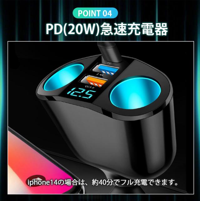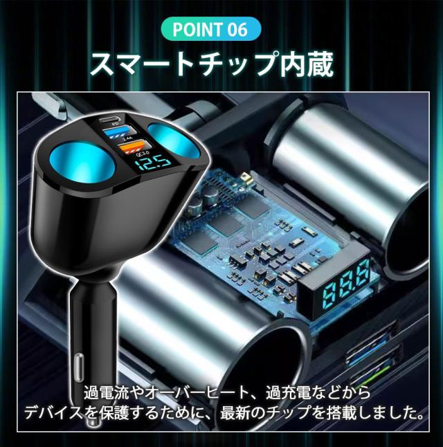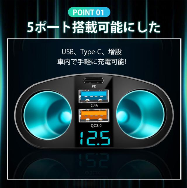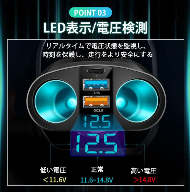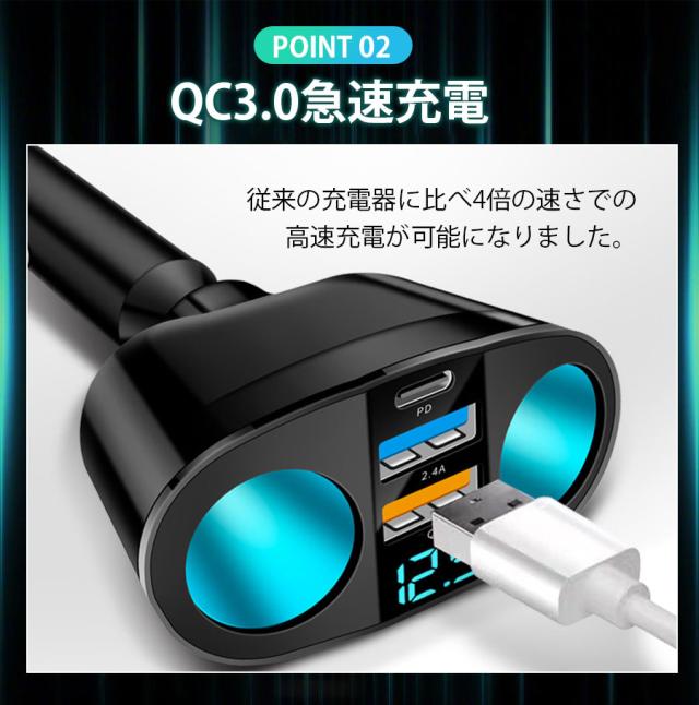 ★即納★ シガーソケット 2連 3連 急速充電 66W usb type-c 増設 車載充電器 2口 電圧表示 12V 24V対応 カーチャ