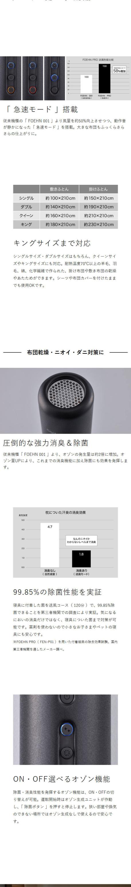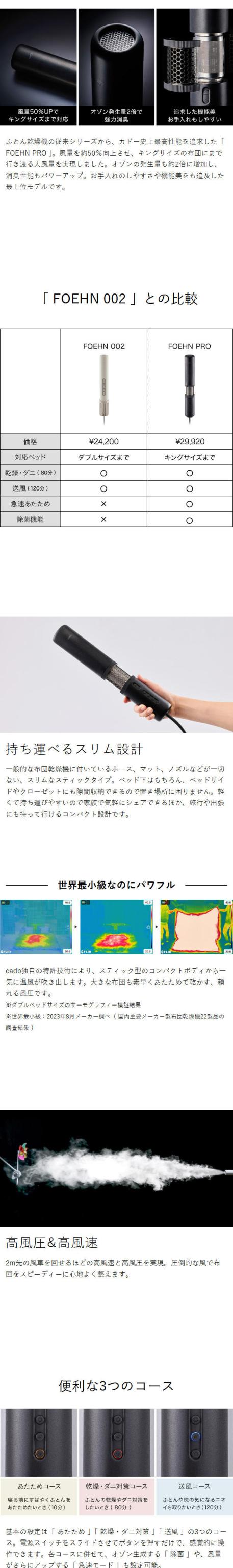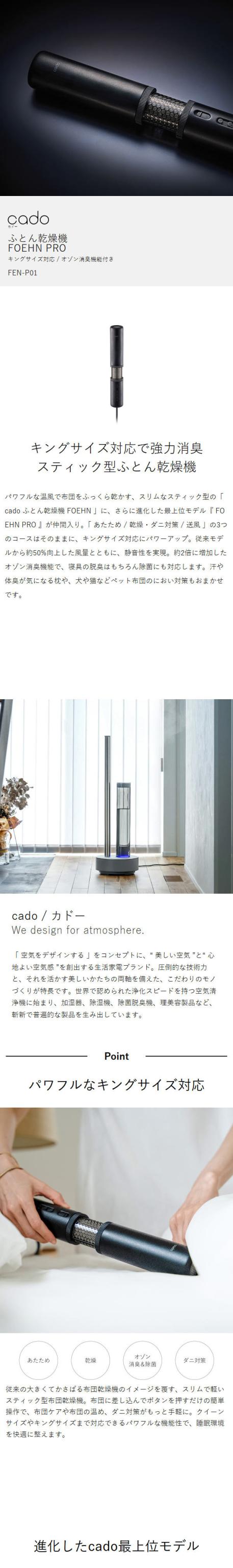 キングサイズ対応で強力消臭 スティック型ふとん乾燥機 パワフルな温風で布団をふっくら乾かす、スリムなスティック型の「 cado ふとん乾燥機 FOEHN 」に、さらに進化した最上位モデル『 FOEHN PRO 』が仲間入り。「 あたため / 乾燥・ダニ対策 / 送風 」の3つのコースはそのままに、キングサイズ対応にパワーアップ。従来モデルから約50%向上した風量とともに、静音性を実現。約2倍に増加したオゾン消臭機能で、寝具の脱臭はもちろん除菌にも対応します。汗や体臭が気になる枕や、犬や猫などペット布団のにおい対策もおまかせです。