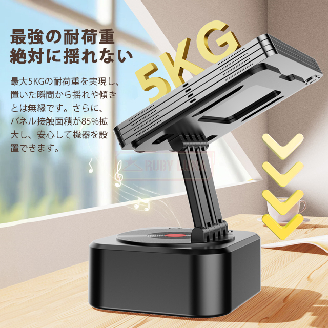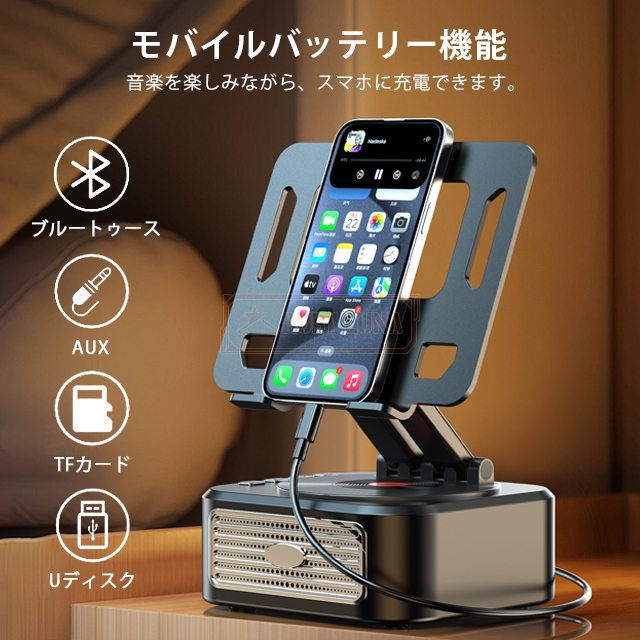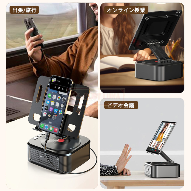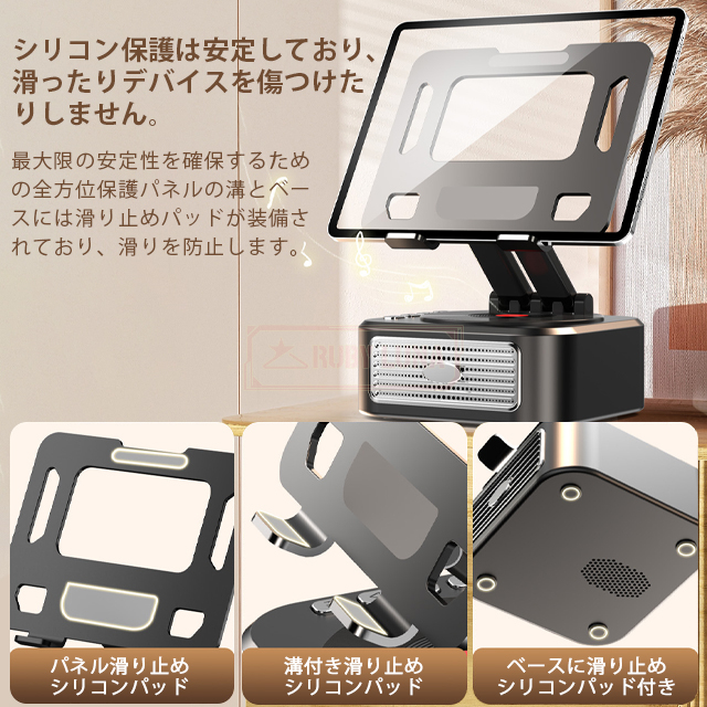| 【安定性と滑り止め】 | ◆スマホホルダーとスピーカーの底部は滑り止めシリコン付き、デバイスを最大限に保護し、傷や滑りを防ぐことができます。 |