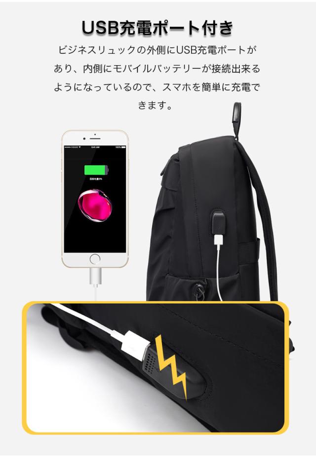 ビジネスリュックの外側にUSB充電ポートがあり、内側にモバイルバッテリーが接続出来るようになっているので、スマホを簡単に充電できます。