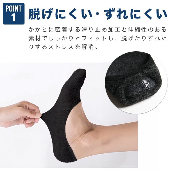 かかとに密着する滑り止め加工と伸縮性のある素材でしっかりとフィットし、脱げたりずれたりするストレスを解消。