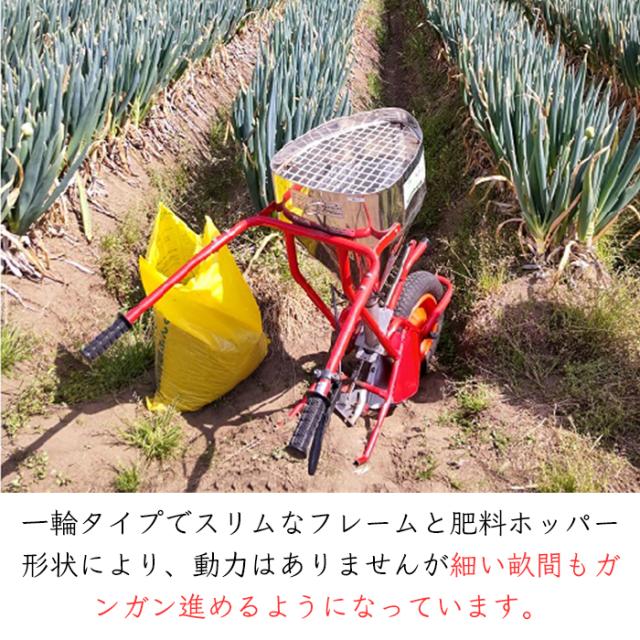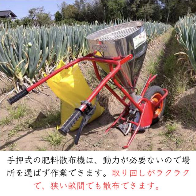 手押式の肥料散布機。動力が必要ないので場所を選ばず作業できます。エンジン駆動ではないので排気を気にせずビニールハウスなどでもお使い頂けます。軽くて持ち運びがし易いので取り回しがラクラク。狭い畝間でも散布できます。