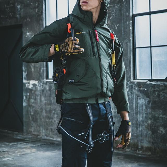 ★ヘルメット収納フード(着脱可能)、フックハンガー、背ランヤードホールを配備しフルハーネスに完全対応