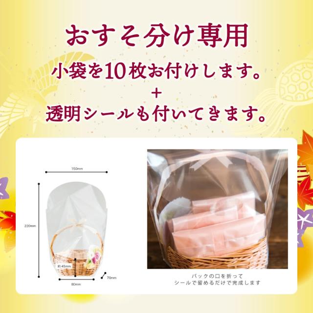 10枚の小袋と透明シールが付属しており、おすそ分け用としても最適