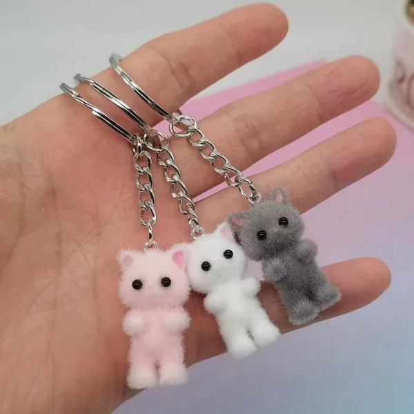 かわいいファジーキティ猫ハートリボンキーホルダー、子猫、かわいい、ピンクリボン、パールハート